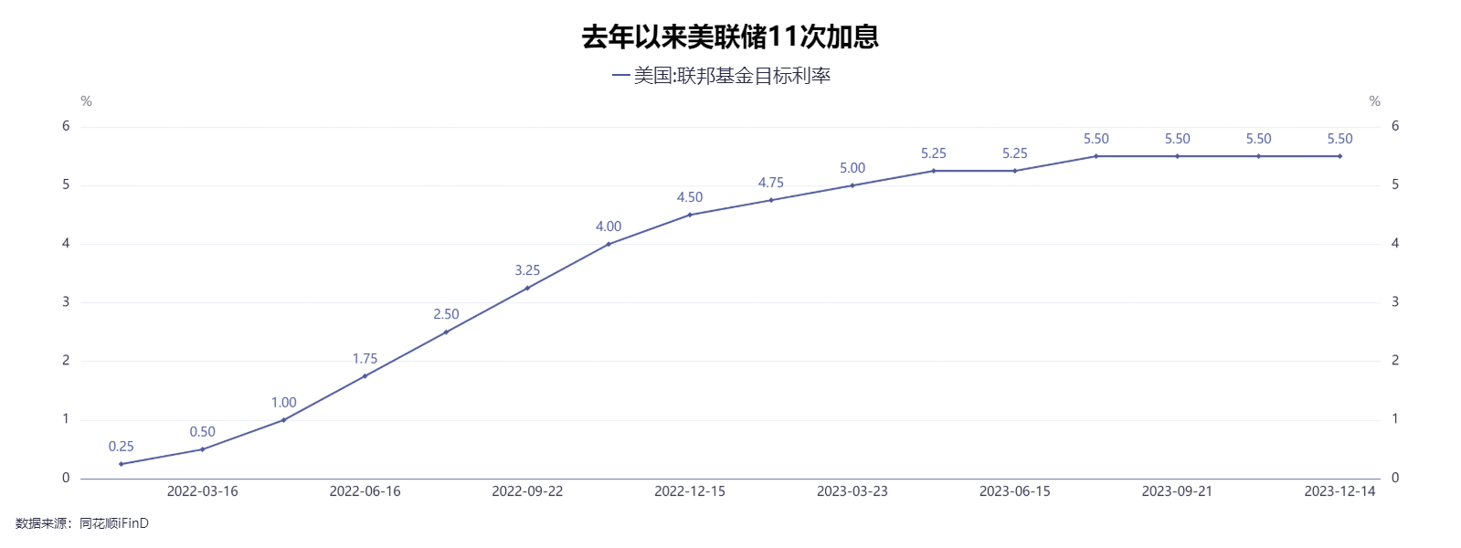 回顾此轮加息历程,从2022年3月至今,美联储本轮加息周期共加息11次,幅度从最开始的25个基点,到后来的50个基点,以及连续4次75个基点,后来加息幅度又逐步放缓。