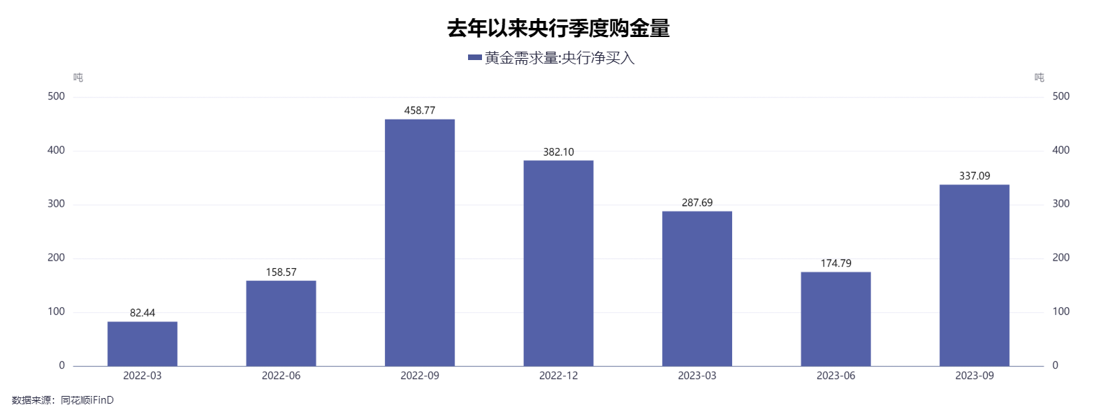 数据显示,应对纷繁复杂的经济和地缘政治局势,全球央行在2022年以1136吨的净购金量创下历史记录。而在2023年前三季度,全球央行净购黄金已达800吨,创下了世界黄金协会有该项数据统计以来的最新纪录。