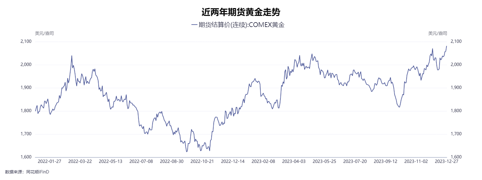 12月,市场提前消化美联储2024年降息预期。12月4日期货黄金创历史新高,达到2152.3美元/盎司。短暂回调后,美联储议息会议召开,黄金再起涨势,站稳2000美元/盎司。